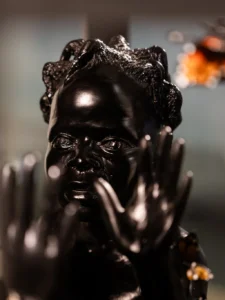 Peju Alatise (b. 1975, Lagos) is a Nigerian interdisciplinary artist, architect, and author whose practice spans sculpture, installation, painting, film, and fiction. She lives and works between Lagos, Nigeria and Glasgow, UK. Trained in architecture at Ladoke Akintola University of Technology, Alatise began her career balancing architectural work with studio practice. Her art engages themes of gender, power, spirituality, and African identity, often grounded in Yoruba cosmology and narrative traditions. In 2017, she was one of the artists selected for Nigeria’s historic debut at the 57th Venice Biennale, where her installation Flying Girls received international acclaim. That same year, she won the FNB Art Prize. Her work has since been exhibited globally, including at the Venice Architecture Biennale (2020), Frieze Sculpture (London, 2022), and is held in the collection of the Smithsonian National Museum of African Art, Chazen Museum of Art at University of Wisconsin, and the August Wilson African American Cultural Center.