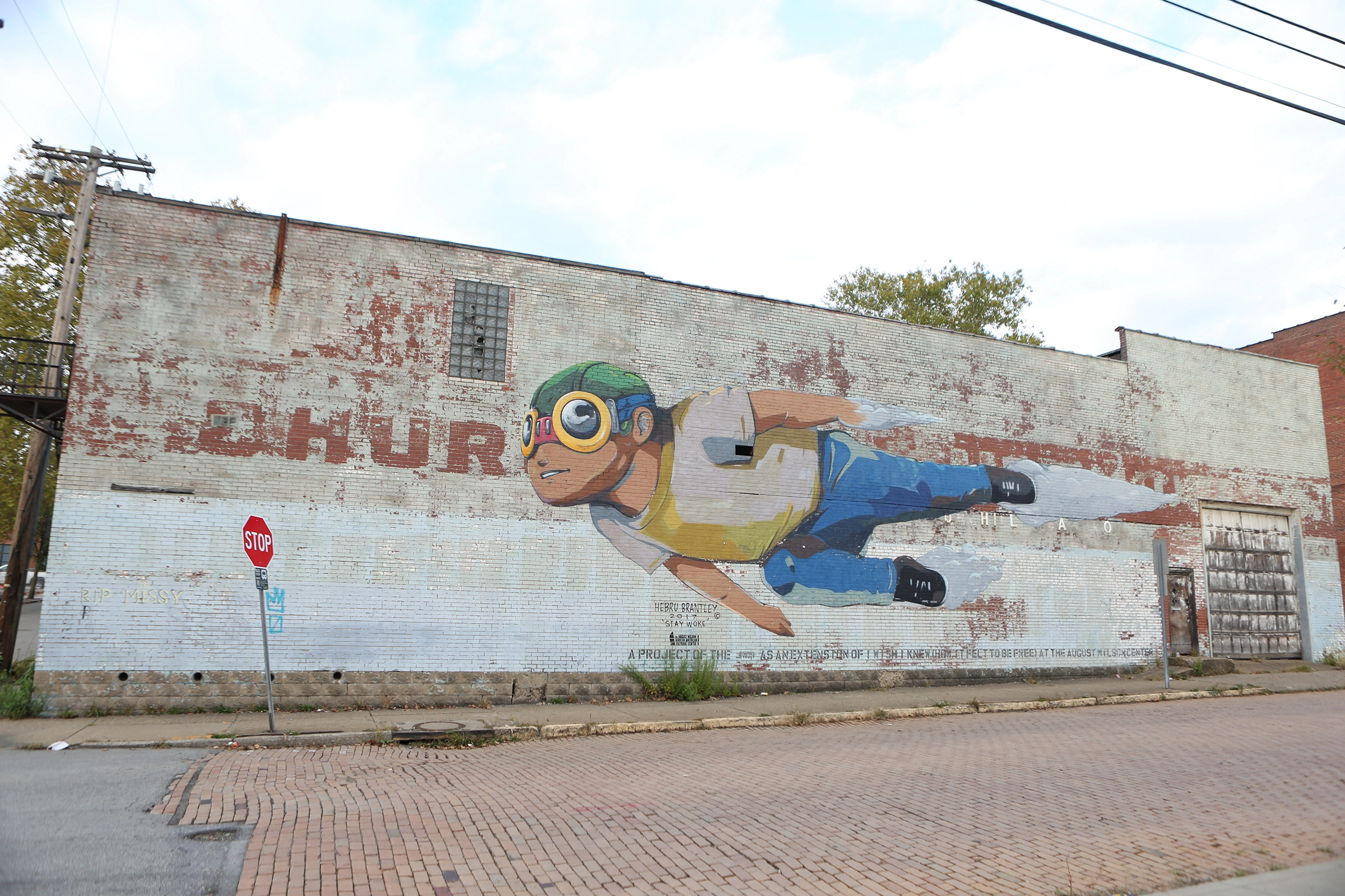 Located at the corner of Wallace Avenue and Pitt Street in Wilkinsburg, this large-scale Flyboy mural by Hebru Brantley stands as a vivid marker of imagination, visibility, and community pride just minutes outside of Pittsburgh. Created following Brantley’s acclaimed exhibition I Wish I Knew (How It Felt To Be Free) at the August Wilson African American Cultural Center, the mural extends the spirit of that exhibition into the public realm.